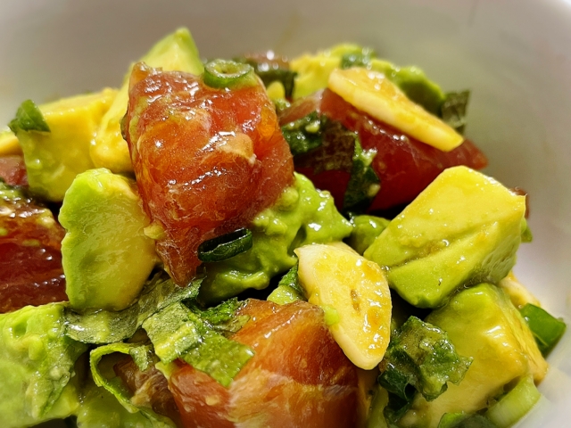と、いいながら画像は‟ポキ(poke)”と言うハワイのローカルフードを載せました。まぐろの刺身を小さくカットししょうゆや食用油をベースにつくった調味料を漬け込んだ料理です。