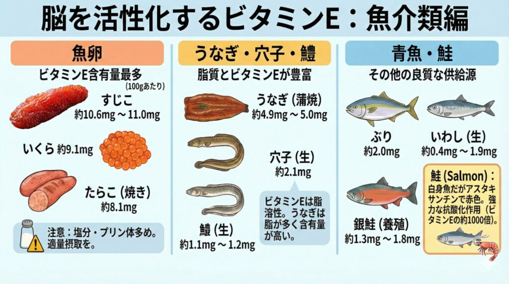 脳を活性化するビタミンEを魚介類で摂取するには、何を食べればいいのか?